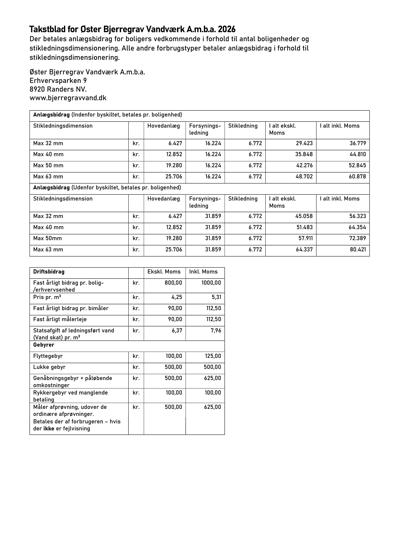 Takstbladet for Øster Bjerregrav Vandværk